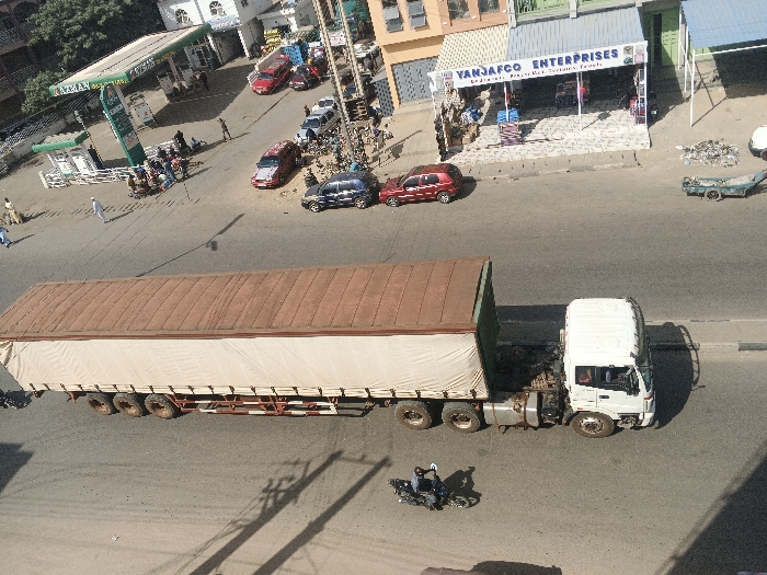 An elevated daytime view captures a street scene in Fagge A, Kano, Nigeria, featuring commercial establishments and vehicular traffic. A white semi-truck with a multi-axle, canvas-sided trailer is the central object, positioned horizontally across the paved road. A motorcyclist on a dark bike is visible below the truck's trailer. To the left side of the street, an "AZMAN" fuel station is active, with several vehicles, including red sedans and white vans, present near the fuel pumps. Multiple pedestrians are observed near the fuel station and traversing the roadway. On the right side of the street, the "YANJAFCO ENTERPRISES" storefront is visible, characterized by blue and white signage and displays of merchandise. Adjacent to it is a building with an orange-brown facade. Several vehicles, including a dark blue sedan and a red SUV, are parked along the curb in front of these businesses. Further down the street, a light blue utility cart containing debris is parked. Shadows from buildings and utility poles are cast across the street, consistent with direct sunlight.