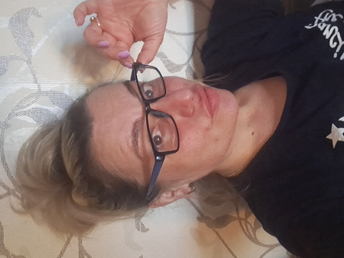 The specific location within the city of Yegoryevsk, Russia, cannot be determined from the visual information provided. The scene is set indoors against a light-colored background with a patterned, possibly floral or botanical, motif in a darker shade. One adult female is depicted in a close-up, self-portrait orientation. She has blonde or light brown hair styled in an elevated bun on the top of her head. Her complexion appears fair with some visible redness or minor skin irregularities. Her eyes are wide open, directed towards the camera. Her lips are slightly puckered. She is wearing dark-framed eyeglasses with blue temples; her right hand is raised, with manicured fingers (light purple nail polish) gripping the right temple of the eyeglasses, suggesting an adjustment or removal action. A gold-colored ring is visible on the ring finger of her right hand. She is wearing a dark, likely navy or black, short-sleeved t-shirt, partially visible, which features a white star graphic on the lower left chest area. A thin gold-colored chain is visible around her neck, and a small gold-colored hoop earring is present in her left ear.