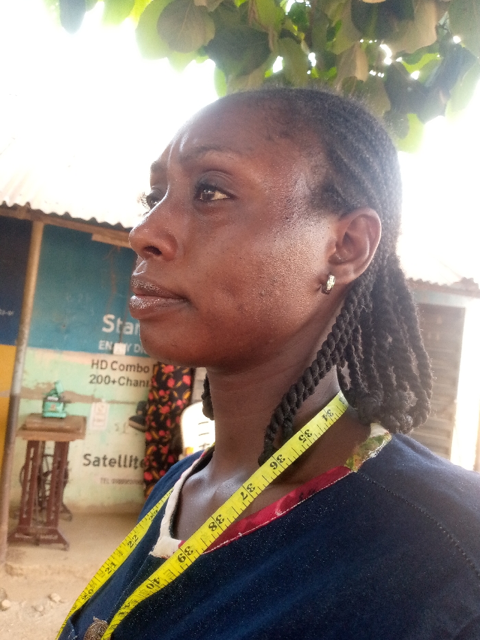A female individual of dark complexion is depicted in a right profile view, looking slightly upwards. She has a black, twisted-braid hairstyle falling to her shoulders and wears a small silver-toned hoop earring in her visible ear. Her lips appear glossy. A yellow measuring tape, marked with black numerals (e.g., 34 to 39 inches), is draped around her neck, resting over a dark blue garment with a patterned collar featuring red, white, and green accents. The scene is outdoors in Maigizo, Nigeria, under bright daylight. In the background to the left, a light blue building wall displays partial text and graphics, including "Star," "ENJOY D," "HD Combo," "200+ Chann," and "Satellite," indicating a service provider advertisement. Below this, a wooden table holds a light green mechanical device, possibly a sewing machine. A person or mannequin wearing a dark, patterned garment is partially visible behind the main subject. Green foliage is present at the top of the frame, and a corrugated metal roof is visible in the far right background. The ground is light-colored soil.