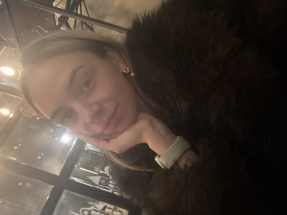A young woman with blonde hair and fair skin rests her chin on her hand. She wears an Apple Watch and floral earrings. She is wearing a large, dark-colored, fur coat. The background shows reflective glass with dark gridlines. The image has soft lighting and is slightly rotated.