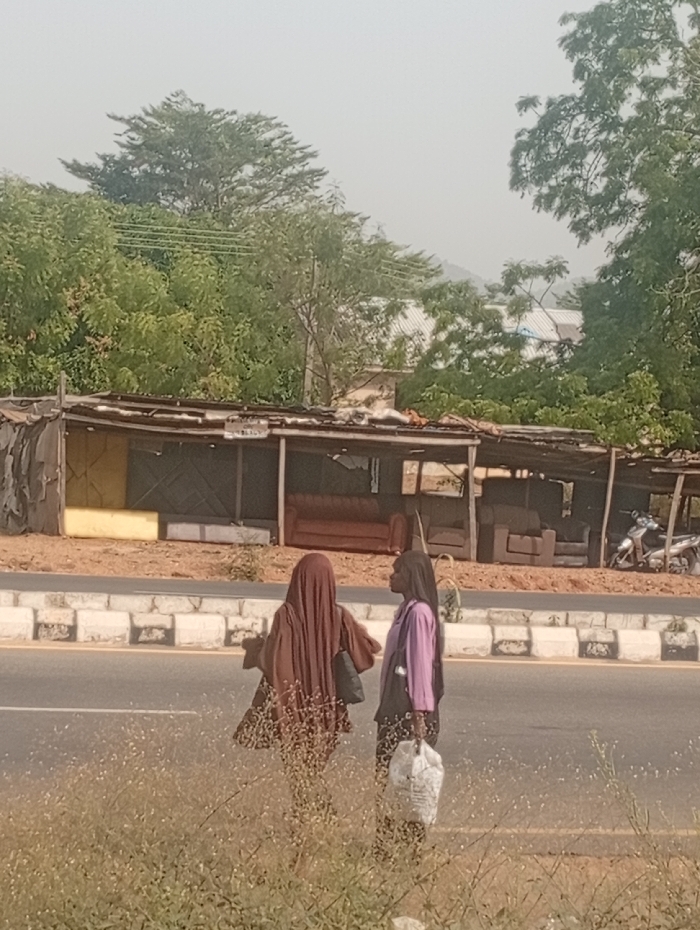 The image depicts a roadside scene in Adankolo, Nigeria, under bright daylight. In the foreground, dry, light-colored wild grasses cover the ground. Two individuals stand on this grassy shoulder adjacent to a multi-lane paved road, which is bordered by a concrete median barrier painted white with black stripes. The individual on the left wears a full-length, flowing brown garment covering their head and body, with a black bag slung over their shoulder, and is positioned facing the second individual. The individual on the right wears a light purple long-sleeved shirt and dark lower garment, with long, dark hair visible, holding a white patterned shopping bag in their right hand, and is looking towards the first individual. They appear to be engaged in a direct interaction. In the background, across the road, a series of open-air stalls or shelters with corrugated metal roofs and wooden supports are visible. These structures house various pieces of furniture, predominantly sofas and chairs, suggesting a roadside furniture vendor. A white motorcycle is parked near these stalls. Beyond the stalls, dense green trees populate the mid-ground, and the far background reveals a hazy sky above what appear to be distant hills or mountains.