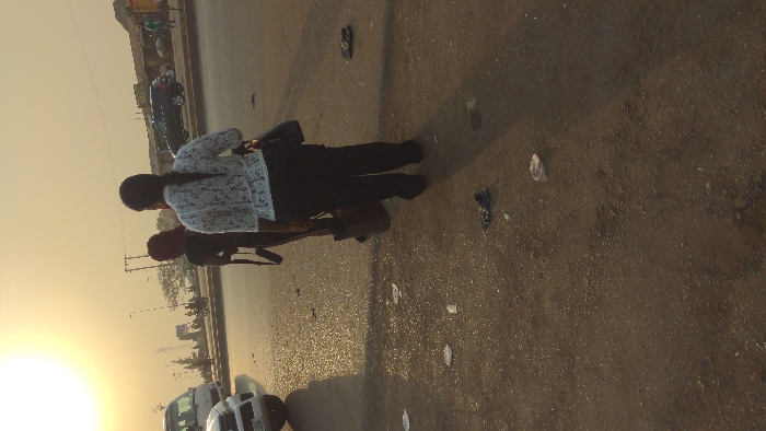 The scene depicts an outdoor street in Nyanya, Nigeria, illuminated by a low sun in the upper left, casting long shadows and contributing to a hazy, yellowish sky