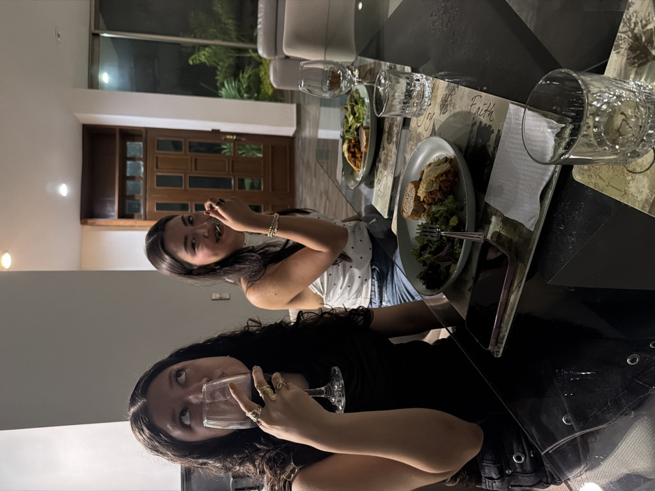 Two young women are seated at a table, apparently enjoying a meal
