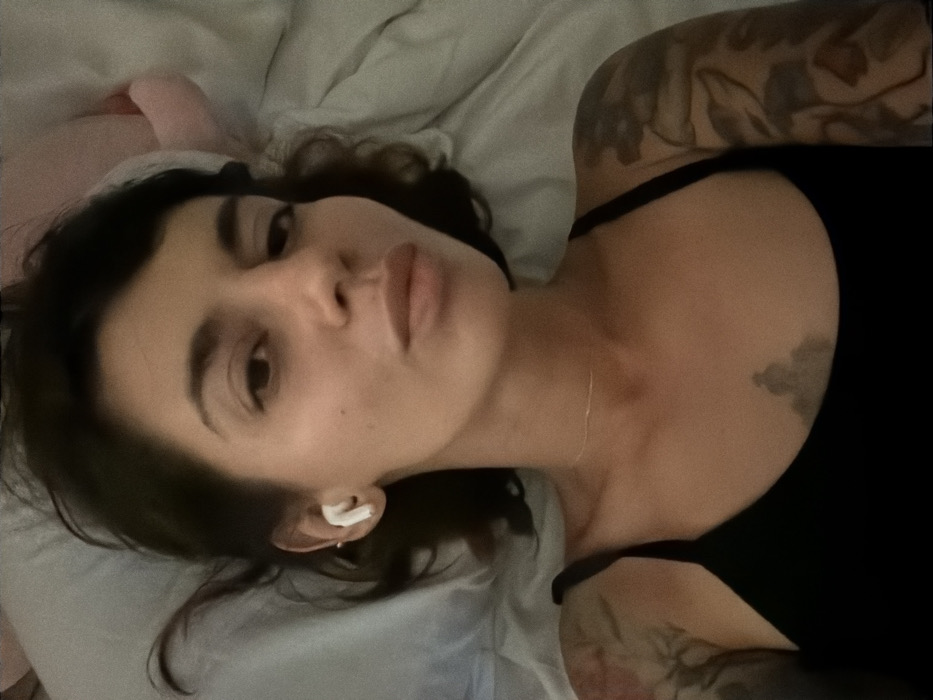 A woman with dark hair and tan skin lies on a white bed wearing a black top. She is positioned at an angle, looking at the camera with a relaxed expression. Tattoos are visible on her upper arms and chest. She has an earpiece in her left ear. A pink object is near her head, possibly a stuffed animal or pillow. The lighting is soft, casting shadows across her face and the surrounding bedding.