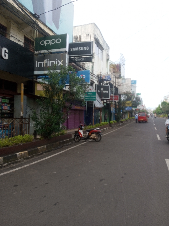 The image depicts a bustling street scene in Phonsavan, Laos, characterized by commercial activity. On the left, a row of multi-story buildings houses various businesses, predominantly mobile phone stores. Prominent advertising signs display brand names such as "OPPO" (with "KEYRIA CELL" below), "Infinix," and "SAMSUNG" (with "SYZIA CELL" below). Other visible signs include "VIVO" and "NSI cellular." Some shops further down the street are closed, indicated by purple roll-down security gates. Along the left side of the asphalt road, a raised planter containing green shrubs and small trees separates the storefronts from the street. A red and white scooter is parked diagonally on the roadside, facing right. The road features white lane markings, including a solid line and a broken line. Further down the street, a red car, possibly a minivan or small truck, is moving away from the viewer. Another person on a motorcycle is partially visible on the far right side of the road. Multiple indistinct vehicles and individuals are present in the distant background, indicating ongoing traffic and activity. The sky is bright and appears overcast. In the furthest background, distant hills or mountains are visible beneath the sky.