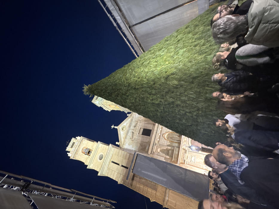 - "A nighttime shot features a towering evergreen-like structure next to a church with a prominent bell tower" by FM-9Yocj1, licensed under CC BY 4.0
