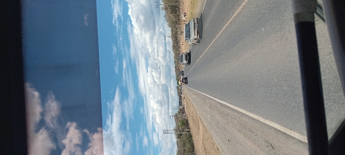 Captured from within a vehicle, a highway stretches into the distance. Several cars are spaced apart on the road. Fluffy white clouds fill the blue sky along the left side of the shot. Power poles run parallel to the road on the left. Some roadside vegetation can be seen along the edge of the asphalt. The shot is somewhat askew. A dark-colored frame is visible on the left and right sides.