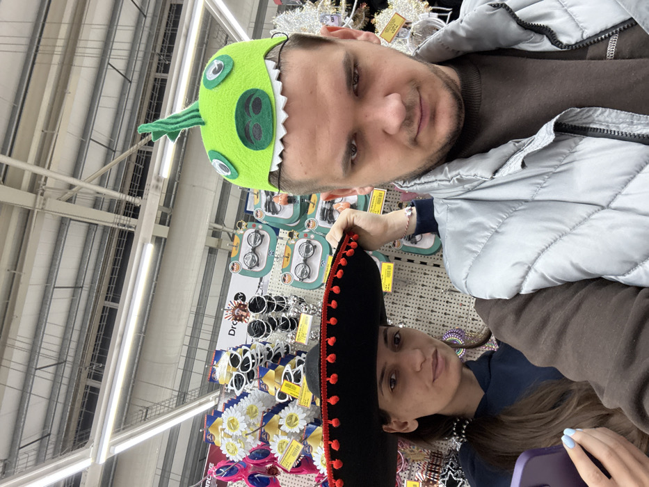 The image captures a posed photograph of two individuals, one male and one female, within a retail store environment in Plovdiv, Bulgaria. The male, positioned in the immediate foreground, wears a light gray puffer vest over a brown long-sleeved shirt and a novelty bright green felt hat designed to resemble a cartoon monster or dinosaur, featuring prominent white eyes and a jagged white mouth. He has short dark hair and a beard. A red and white string bracelet (Martenitsa) is visible on his left wrist. He directs a serious gaze towards the camera. The female is positioned behind and to the left of the male, partially obscured. She wears a dark blue hooded sweatshirt and a large, wide-brimmed black sombrero adorned with red pom-poms around its edge. Her long dark hair is visible. She holds a purple smartphone in her left hand, her fingernails painted light blue, and looks directly at the camera with a neutral expression. Her right hand is near the brim of the sombrero, possibly holding or adjusting it. The background reveals typical retail shelving units with white pegboards displaying various novelty items, including brightly colored flower-shaped headwear, multiple styles of novelty glasses on blister packaging, and other festive accessories, each with yellow price tags. The ceiling features an exposed industrial design with metal beams, ducts, and long fluorescent lighting fixtures, characteristic of a large supermarket or hypermarket. The precise store name or specific address within Plovdiv, Bulgaria, is not discernible from the visual information.