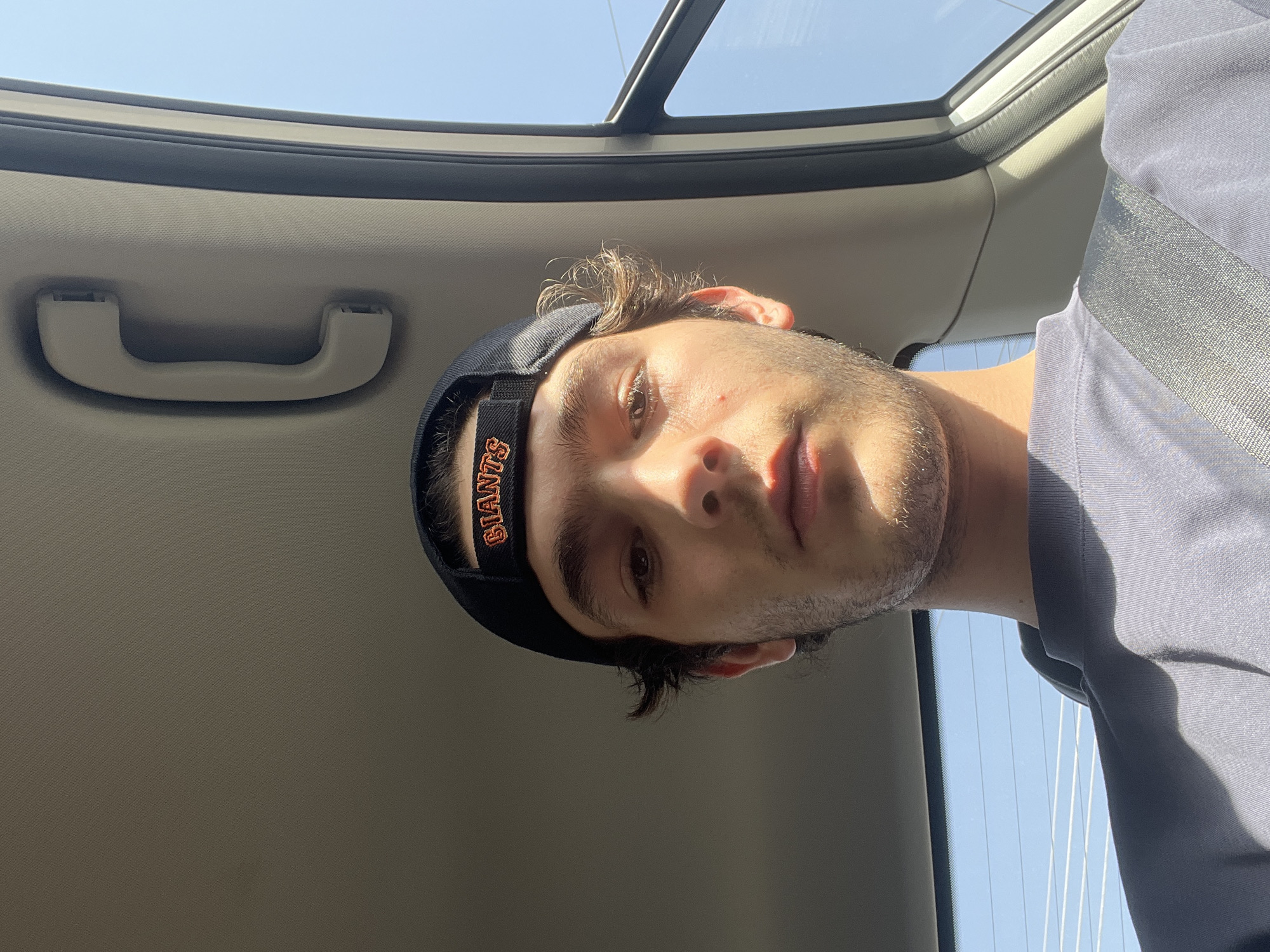 A man wearing a black baseball cap with "GIANTS" embroidered in orange is in the interior of a vehicle, presumably a car. He is wearing a dark gray shirt and a seatbelt. The vehicle has a sunroof. The interior of the vehicle is beige. There is a handle on the interior ceiling of the vehicle. The man is looking down at the camera. The location is not discernible as being in Puebla, Mexico.