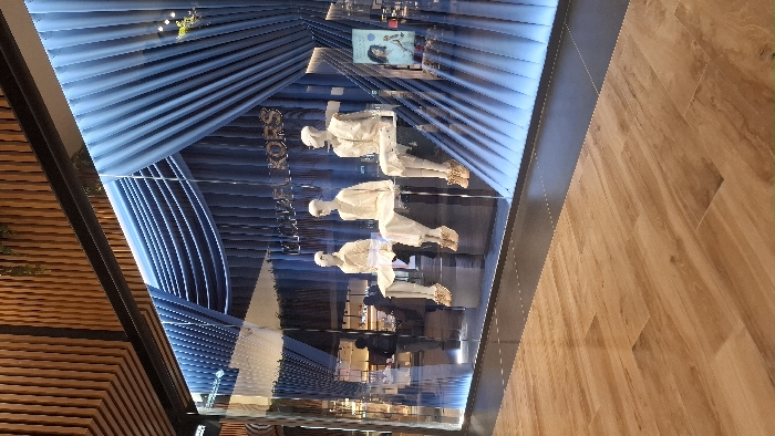 A tilted, overhead shot captures a retail space. Blue, linear designs adorn the ceiling above a display case featuring three mannequins dressed in cream-colored outfits. Above the mannequins is a screen playing a video. The words "MICHAEL KORS" are visible on the glass of the display case. Outside the case, a wooden floor is noticeable, and a textured wall is to the left of the display.