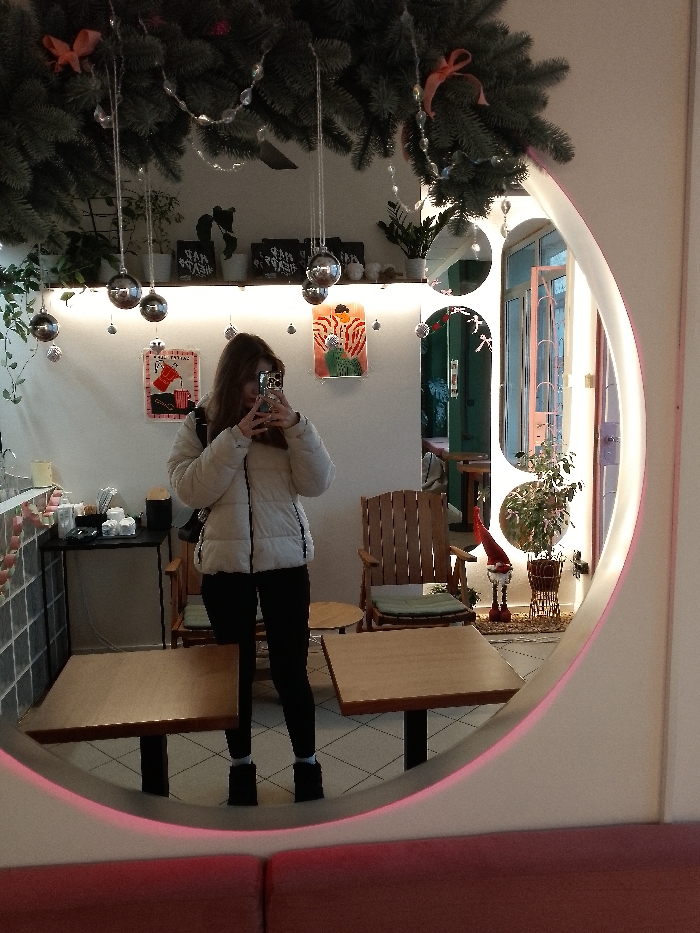 A person in a white puffer jacket and black leggings takes a selfie in a uniquely shaped mirror. Above, festive greenery adorned with silver ornaments and bows hangs, mirroring the cafe's decor. Behind the person, two wooden chairs are visible near tables. Through the mirror's reflections, a plant, Christmas decorations, and an outside area with multiple doorways are seen. The mirror's edge is lined with a pink light.