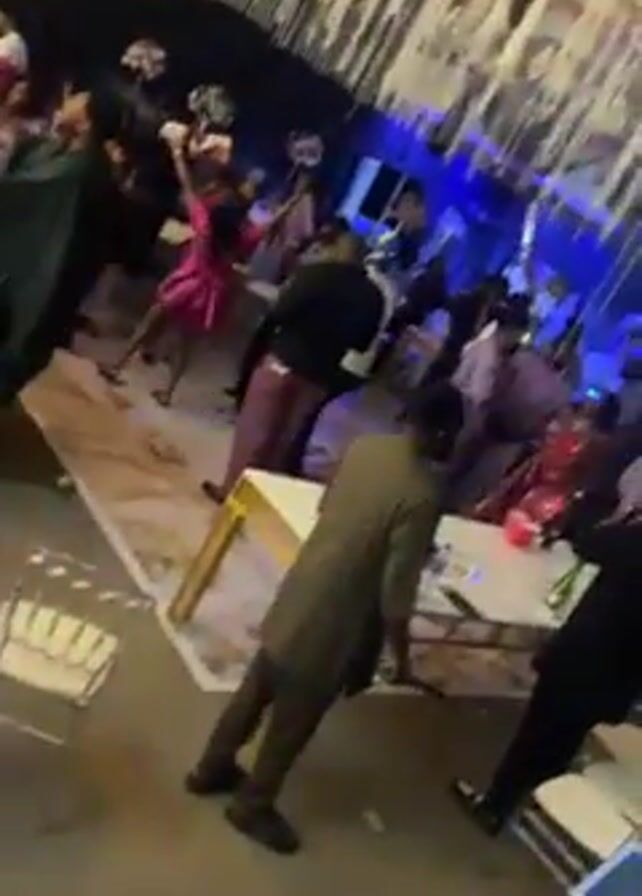 lively dance floor at an event. Many people are dancing and moving around, with a few tables and chairs scattered around the periphery. A woman in a bright pink dress stands out as she dances enthusiastically. The lighting includes blue hues and spotlights, adding to the energetic atmosphere. The backdrop appears to have a decorative pattern.