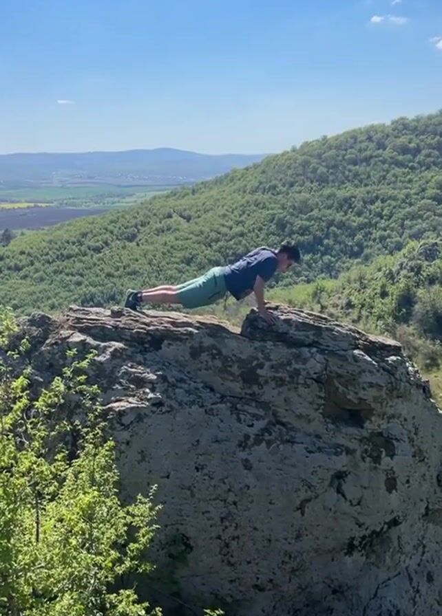 A man is doing push-ups on a large rock on a sunny day. The man is wearing a blue shirt and green shorts. He is positioned on the flat top of the rock with his hands on the surface. Behind him is a scenic view of rolling green hills and a valley in the distance. The sky is blue with some light clouds. A green bush is visible in the lower left corner of the frame.