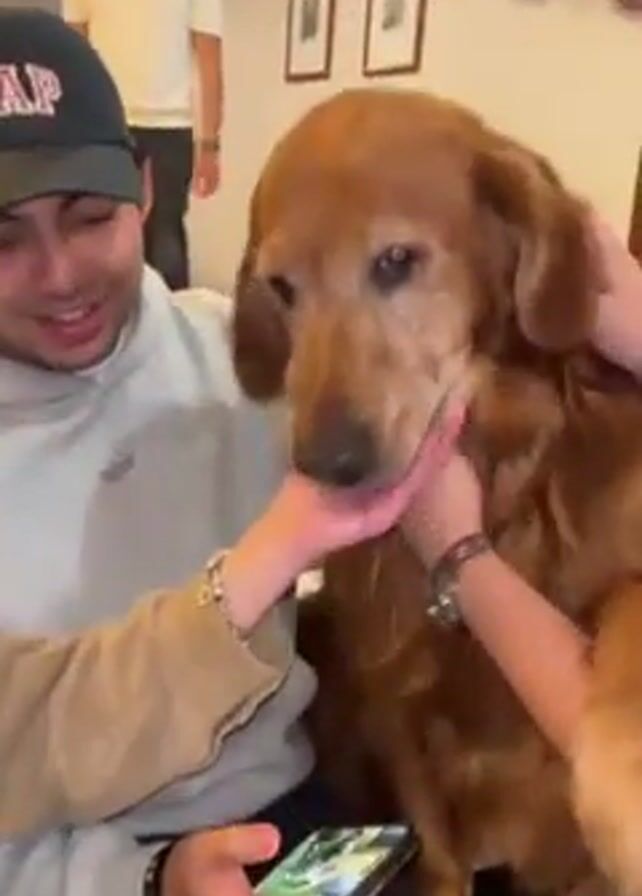 A light-skinned man with dark hair is seated, holding a cell phone, while petting a golden retriever dog. Another person with dark curly hair stands close to the dog, embracing it. The dog is predominantly brown with some graying around its face. The man holding the phone is wearing a light gray hoodie and a dark green baseball cap. Other people are visible in the background, though out of focus. The location appears to be indoors, possibly a restaurant or a private residence, based on the neutral-colored walls, lighting, and background elements.