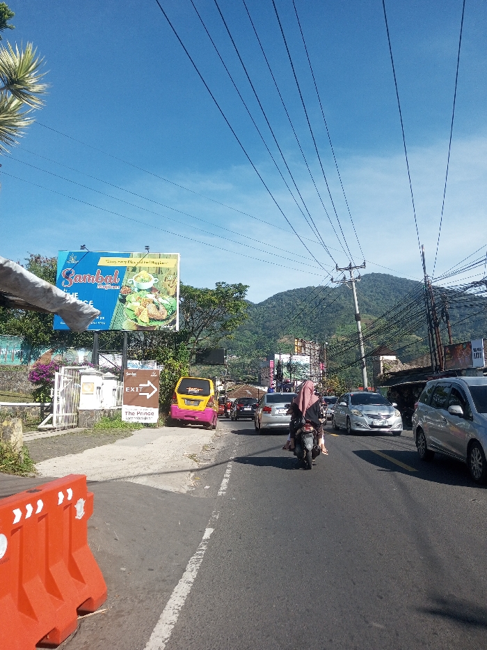 This image captures a daytime scene on a multi-lane asphalt road in the city of Ka Thaung (Upper), Myanmar, under a clear blue sky with sparse clouds. In the foreground, to the left, an orange plastic traffic barrier with white reflective stripes is partially visible. Adjacent to the road, a concrete sidewalk leads to a white metal gate with a stone pillar. Beyond the gate, green foliage and purple flowering plants are present. Above this, a large blue and yellow billboard advertises "Sambal Majikan" with images of various food dishes, including fried chicken and rice. Below the billboard, a brown sign with an arrow points right and reads "EXIT The Prince." An unidentified light gray object, possibly a decorative element or part of a structure, extends into the frame from the far left, partially obscuring the billboard. A yellow vehicle with pink accents is parked on the side of the road, facing away from the viewer. The road features a solid white line marking the left edge and appears to have at least two lanes of traffic moving away from the viewer. A person wearing a pink hijab is riding a black scooter or motorcycle in the left lane, with a passenger seated behind them. Behind the scooter, a silver sedan (resembling a Toyota Vios) is visible, followed by additional vehicles further down the road. On the far right lane, a light silver minivan or SUV is also visible. In the midground, utility poles with numerous overhead power lines are prominent. The background is dominated by a densely forested mountain range under the bright sky. Additional structures and smaller billboards are visible on the left side of the road in the distance, partially obscured by trees.