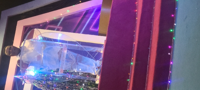 The image depicts an indoor scene on an illuminated stage, likely in Aba, Nigeria