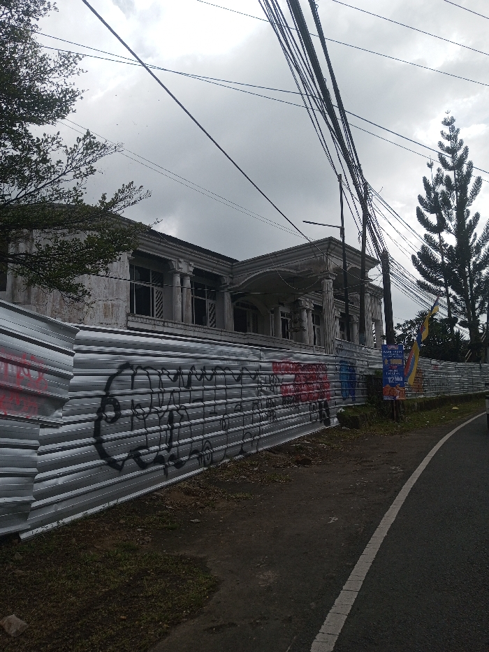 An unfinished, large building with classical architectural details sits behind a corrugated metal fence covered in graffiti. The overcast sky and bare trees suggest a bleak or transitional season. A sign, seemingly an advertisement, is placed along the fence near the edge of a narrow road, partially obscured by vegetation. Power lines cross the sky above the scene.