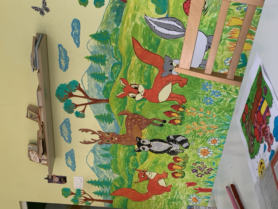 This image depicts an indoor room in Sofia, Bulgaria, featuring a large, colorful mural painted on a light yellow wall. The mural illustrates a cartoon forest or meadow scene populated by various animals: a reddish-brown squirrel on the far left, a black and white raccoon, a brown deer with prominent antlers, a red squirrel, and a partially obscured grey and white skunk with another small grey animal, situated towards the right. The landscape includes rolling green hills, numerous green pine trees, brown deciduous trees, blue clouds, and distant blue mountains. The lower section of the mural shows groups of orange-capped mushrooms and diverse colorful flowers. A white double light switch is mounted on the wall to the left of the deer's head. Above the mural, a light-colored floating shelf is mounted, holding multiple books, some stacked, some upright. One item on the shelf resembles a small religious icon. A dark, possibly witch-shaped, decorative cutout hangs on the wall below the left end of the shelf, and a dark butterfly cutout is affixed to the wall on the right. In the lower left foreground, a white table surface is visible. Two markers, one pink and one brown, rest on the table. A children's coloring page, partially colored and depicting cartoon animals (including a rabbit) in an outdoor scene, lies flat on the table. A portion of an open book or notebook is visible on the far left edge of the table. A light-colored wooden chair with a slatted backrest extends into the frame from the right side, partially obscuring the lower right section of the wall mural.