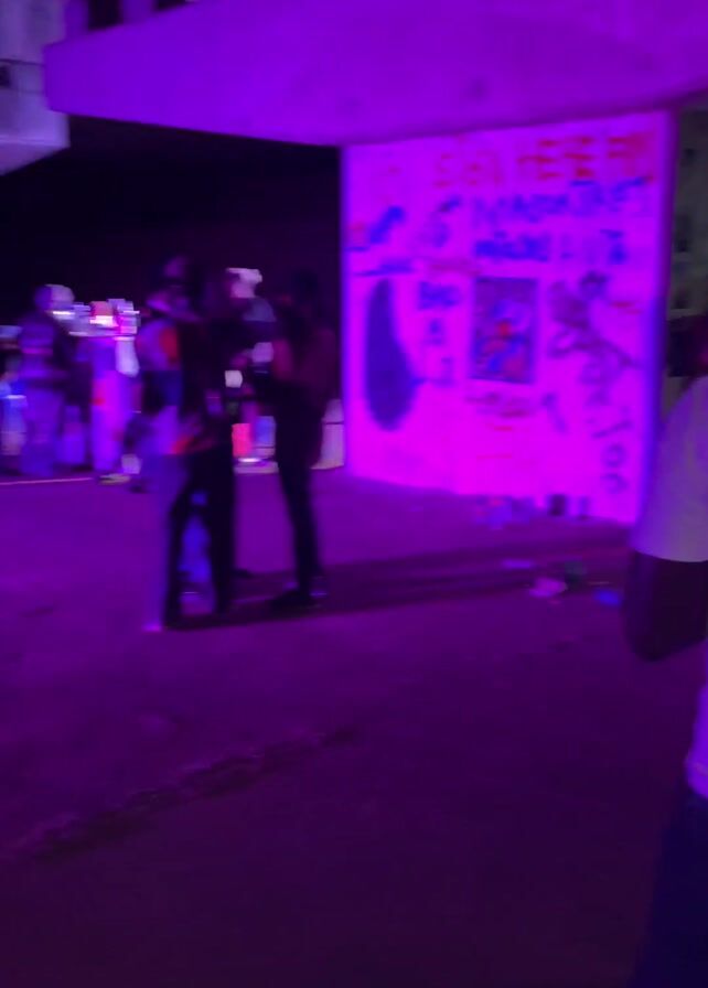 group of people gathered under a bridge, with music playing in the background. There's graffiti on the wall of the bridge pillar. Most of the people are standing, some holding phones, possibly recording or taking pictures. The lighting is predominantly purple, creating a somewhat dim and atmospheric setting. There are scattered items on the ground, potentially spray paint cans related to the graffiti. The scene appears to be a casual gathering, possibly an impromptu event or hangout spot.