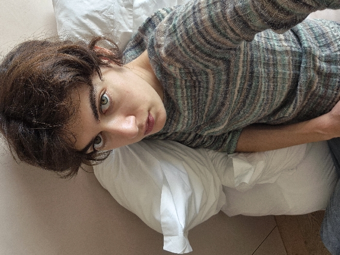A single individual is depicted in an indoor setting. The person, appearing young adult with short, dark, curly hair and prominent green eyes, is positioned against white bedding, consisting of pillows and possibly a duvet. They are wearing a long-sleeved, patterned knitted sweater featuring horizontal stripes in various shades of green, blue, grey, brown, and cream. Part of grey trousers is visible at the bottom left. Behind the person's head and to their left, a plain, light-colored wall (beige or pale pink) is visible, and a segment of light-toned wooden flooring can be seen in the lower left corner. The individual is looking directly upwards towards the camera with a neutral to slightly intense expression. The environment does not contain any discernible features or landmarks to identify a specific location within the city of London, United Kingdom, or any other geographical area.