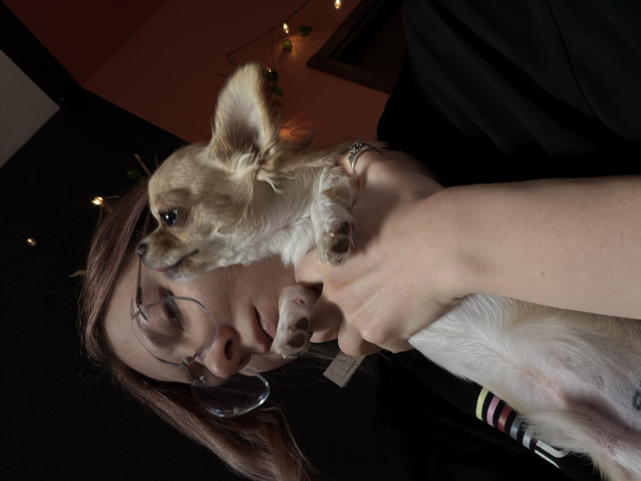 The image depicts an adult female holding a small dog in an indoor setting in Boreti, Montenegro. The female, positioned on the left side of the frame, has light skin, light brown hair with reddish undertones, and wears frameless eyeglasses with circular lenses. Her expression is neutral, with her gaze directed slightly downwards. She wears a dark-colored shirt, possibly black, with a vertical multicolored striped pattern visible on the upper left sleeve. Her left hand supports the dog from underneath, while her right hand is partially visible, displaying a silver-colored ring with small stones on her ring finger. The subject being held is a small, long-haired chihuahua puppy, predominantly light tan or cream-colored, with white fur on its chest and belly. The dog faces right, positioned close to the female's face, with its head tilted slightly upward and its dark eyes looking towards the upper right. One of the dog's front paws is visible near the female's chin. The background is dimly lit. The upper left and central portions feature a dark, unidentifiable surface, possibly a ceiling or wall. The upper right segment reveals a reddish-orange wall section. A string of small, warm-toned lights, possibly fairy lights, with sparse green foliage elements, is draped across the upper right background. A dark doorway or opening is partially visible on the far right. The overall lighting suggests an artificial light source, likely from the string lights and ambient indoor illumination.