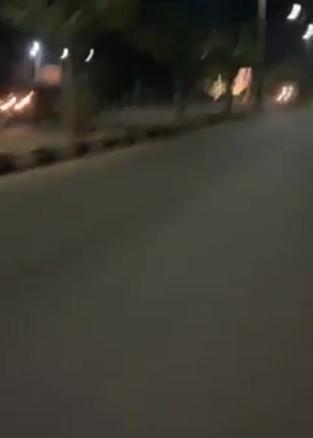 low-angle view of an empty street at night. There are streetlights illuminating the road, and some trees and buildings are visible in the background. A car is driving in the distance. The camera is moving, giving the impression of someone walking or riding a bike along the sidewalk. A person is briefly visible at the upper right edge of the frame. Someone is speaking, but the audio is difficult to understand.