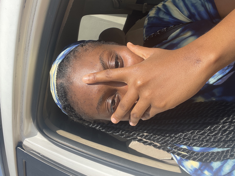 A single female individual is depicted within the interior of a vehicle, in the city of Rafin Bauna, Nigeria