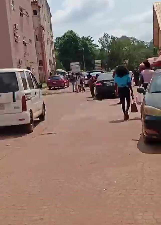 street scene on a sunny day. Several people are walking, and cars are parked or driving. There are buildings on either side of the street. The street surface is reddish-brown and patterned. A white van is parked on the left. A woman with dark hair is walking towards the right side of the frame. There are vendor stalls with umbrellas visible in the background. A green taxi is also parked on the left.