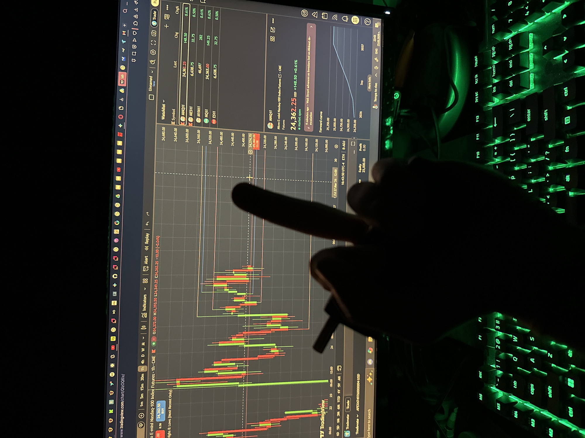 A computer monitor displays the TradingView platform featuring a candlestick chart for Micro E-mini Nasdaq-100 Index Futures (MNQ1!), showing a current price of 24,362