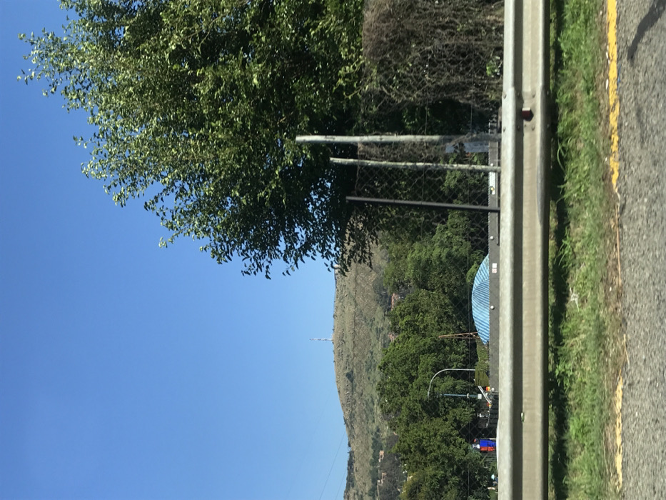 A roadside view with a highway barrier dominating the foreground. Lush green foliage cascades from the top left, meeting a chain-link fence. Beyond, a grassy hill rises under a clear blue sky. Trees dot the landscape, obscuring structures at the hill's base. A communication tower stands atop the hill. The road's edge, defined by a yellow line and green grass, contrasts with the gray asphalt.