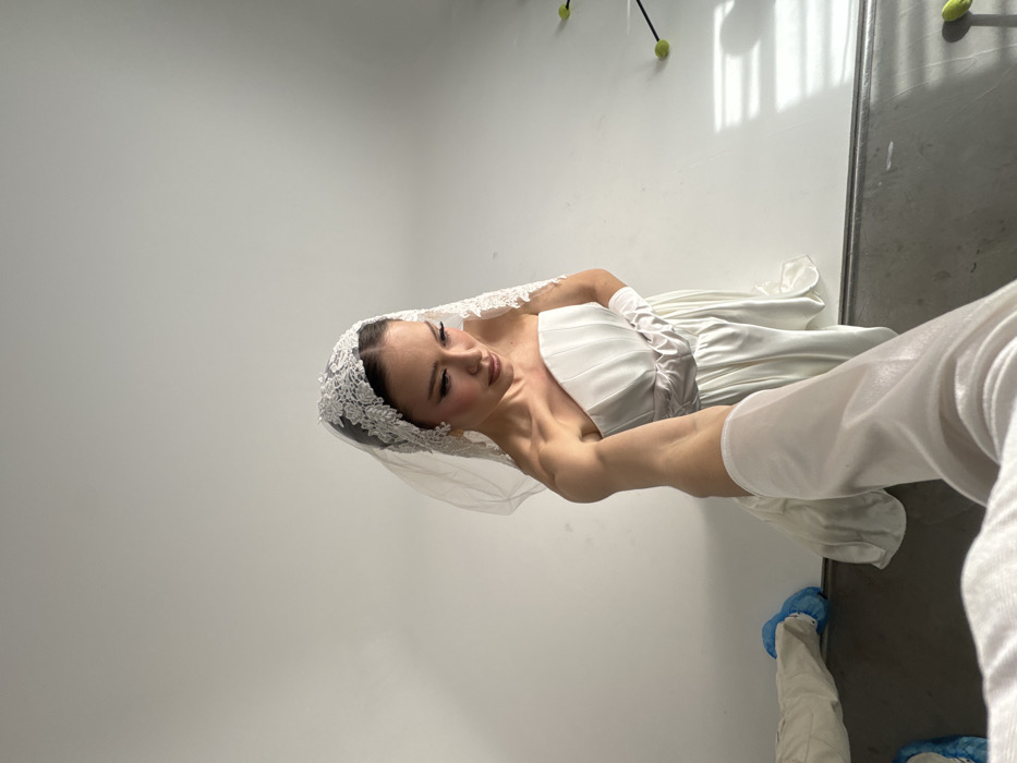 This image captures a female subject posing in a photography studio located in Bat Yam, Israel. The studio features a seamless white cyclorama backdrop and a two-toned floor, transitioning from white to a darker gray surface. The subject, positioned centrally, is viewed from a high angle, with her body angled slightly towards the camera. She is dressed in a white strapless bridal gown, accessorized with long white gloves and a white lace veil featuring floral embroidery draped over her head. Her face is made up, and her gaze is directed downwards. Her right arm is extended directly towards the camera, prominently occupying the lower foreground of the image, while her left arm is bent, with her hand positioned near her waist. To the far left, the lower legs of another individual are partially visible, wearing white pants and blue disposable shoe covers, standing on the gray floor. On the right side of the white floor, a black photography light stand with three green-tipped feet is present. Shadows from the subject and studio equipment are cast onto the white surfaces.