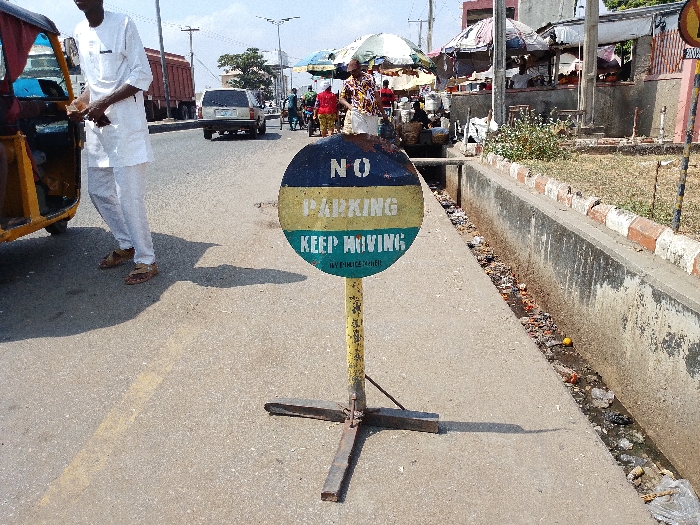 The image depicts an urban street scene in Lokoja, Nigeria, under bright daylight. In the immediate foreground, centered on a light-colored asphalt or concrete road, stands a circular "NO PARKING KEEP MOVING" sign. The sign is weathered, colored blue, yellow, and green, mounted on a yellow metal pole with a black metal cross-shaped base. To the left of the sign, partially visible, is a yellow auto-rickshaw (keke Napep). A male subject, dressed in a white kaftan and trousers with brown sandals, stands beside the auto-rickshaw, facing slightly left. His right hand holds a small, dark object. A faint yellow line is visible on the road surface, extending from the bottom center. Shadows from the subject and the auto-rickshaw are cast towards the right, indicating direct sunlight from the left. Further down the road, a silver SUV is visible, and a large red truck is parked on the left shoulder. To the right of the sign, a concrete drainage ditch runs parallel to the road, filled with stagnant water and an accumulation of refuse, including plastic items and organic debris like an orange peel. The ditch is bordered by a concrete curb topped with alternating red and white painted bricks. Beyond the curb, a strip of dry, sparse grass and scattered vegetation is visible. In the background on the right, an informal market operates, characterized by multiple stalls shaded by various tarpaulins and umbrellas. Several individuals are present within the market area. Utility poles and overhead lines are visible against a hazy sky, and buildings with light-colored facades are discernible in the distance.