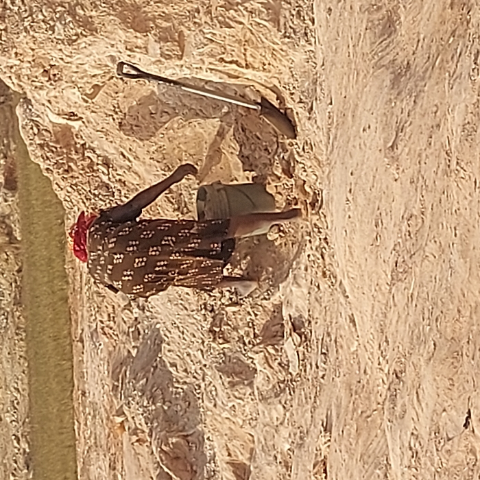A person with a red headscarf and patterned brown dress stands on a rocky, sandy terrain, possibly a quarry or desert. A green container is near the person, and a shovel lays on the rocks. The background shows a vertical ridge of sandy soil or rock, possibly a cliff or excavated area. A patch of green grass is visible. The image appears to be rotated, giving a disorienting view of the scene.