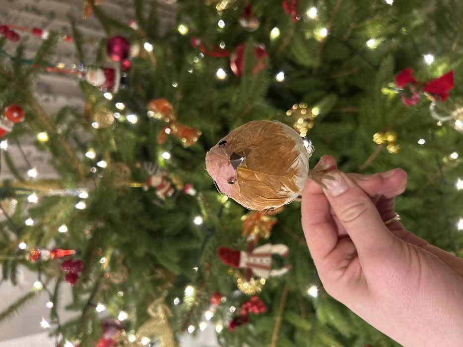 - "A hand holds a small, fuzzy, bird-shaped Christmas ornament against the backdrop of a decorated Christmas tree" by FM-q2mpF2, licensed under CC BY 4.0