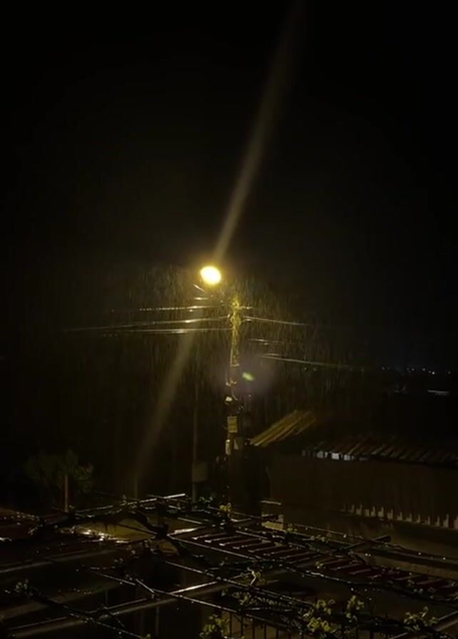 dark, rainy night. A street light illuminates the scene, creating a bright, vertical streak in the darkness. Rain is falling heavily, with visible streaks in the light. Below the light, there is a metal structure with budding plants. In the background, a small building with a dark roof is visible. Beyond that, a scattering of distant lights suggests a town or city.