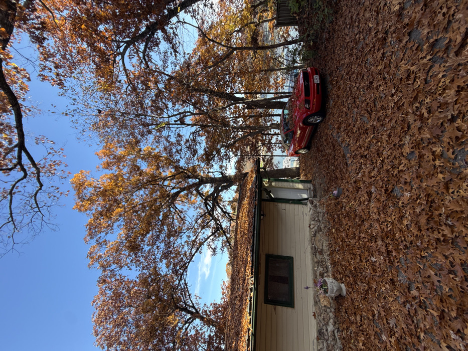 A red car parks on a leaf-strewn driveway beside a beige house with a green trim. Fallen leaves cover the roof and surrounding ground, suggesting autumn. Trees with orange and brown leaves frame the scene against a blue sky with wisps of clouds. A glimpse of water or a lake is visible in the background through the trees.