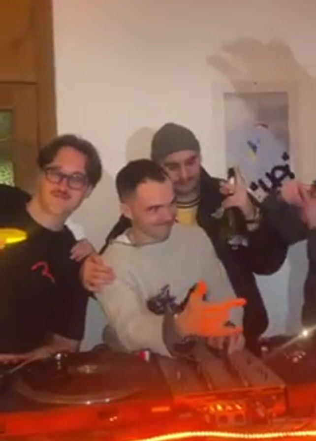 A group of about five young men are gathered around a DJ set in what appears to be an indoor space, possibly a house or apartment