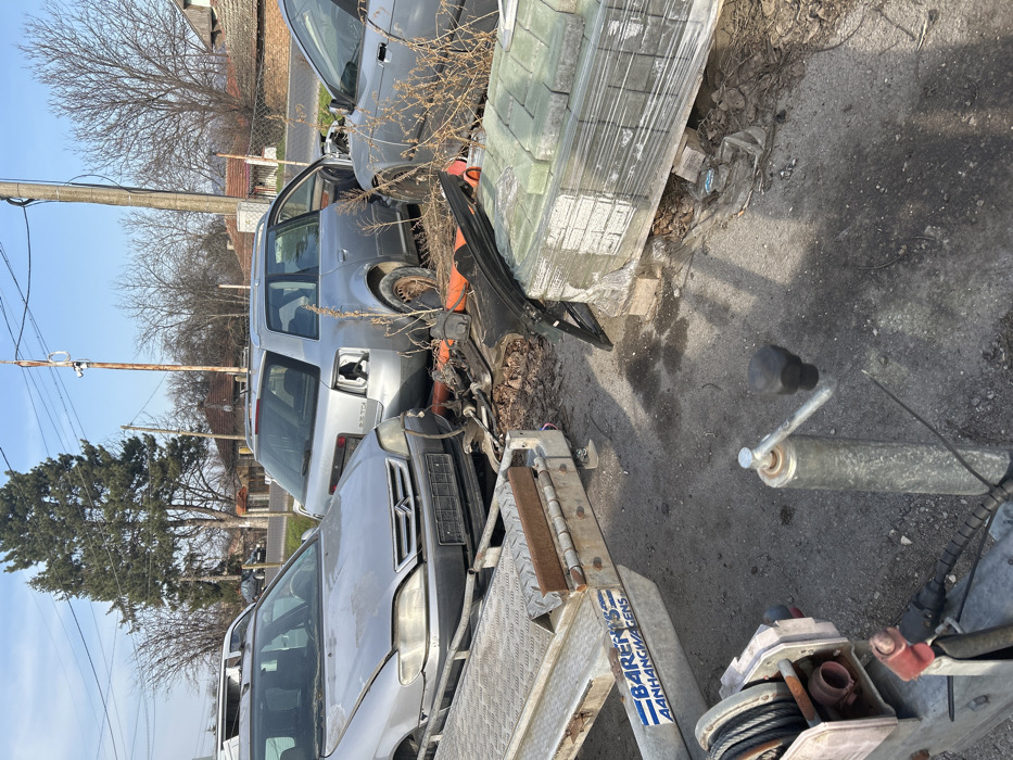The image depicts an outdoor vehicle storage or salvage area in Radanovo, Bulgaria, under daylight conditions. In the foreground, the front section of a silver car transport trailer with a diamond plate surface is visible, featuring a winch on the left and a trailer hitch jack stand. A "BARENS AANHANGWAGENS" sticker is affixed to the trailer. Partially loaded onto this trailer is a silver Citroën Xsara Picasso, missing its front bumper and with its hood slightly ajar. Adjacent to the Citroën, a silver Audi A6 C5 Avant (wagon) with "2.5 TDI" badging is parked. This vehicle is visibly stripped and damaged: the rear left taillight is absent, the rear left wheel is missing exposing a rusty hub, and the front passenger door is either open or detached. Various vehicle components, including engine parts, dark panels, and orange pipes, are scattered on the dirt and asphalt ground between the vehicles. To the right of the Audi, a wooden pallet holds a stack of light-colored rectangular blocks, likely paving stones, wrapped in clear plastic. Dry, brown weeds and debris are present around the vehicles and objects. In the background, several residential buildings with tiled roofs are visible amidst bare deciduous trees and a prominent evergreen tree on the left. Utility poles with overhead power lines traverse the scene, one pole equipped with a security camera. A paved road with a dark sedan is faintly visible in the far background. The sky is clear and blue. No individuals are present in the scene.