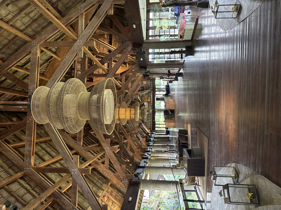 The image depicts the interior of the main lobby at the Sheraton New Caledonia Deva Spa & Golf Resort, located in Bourail, New Caledonia, France. The scene presents a wide-angle, slightly elevated view looking down a spacious, high-ceilinged hall. The ceiling features a prominent exposed timber truss system, with a visible thatched roof between the wooden beams. Multiple large, tiered, woven wicker or rattan chandeliers are suspended along the central axis of the hall, emitting a warm light from their internal fixtures. The flooring consists primarily of dark, polished wooden planks, which transition to lighter, textured stone or tile in peripheral areas, notably in the foreground on the left. Along the left side, several lounge seating arrangements are visible, comprising dark-colored sofas, armchairs, and low tables positioned on rectangular area rugs. A long, dark wooden console table is placed against the left wall, adjacent to thick, round columns adorned with sculpted, relief patterns. In the immediate foreground on the left, two black metal-framed lanterns with clear glass panels sit on a stone-patterned floor section, each containing a small, golden, decorative object. Towards the mid-ground on the right, a reception desk or bar area constructed from light-toned wooden slats is present. Further into the background, large glass panels and doorways offer views of lush green foliage and an outdoor environment. Several dark, abstract, organic-shaped sculptures are displayed on pedestals throughout the hall, particularly along the right side. A brightly lit display case containing various colorful items is visible through a glass partition on the far right. A single individual, wearing a dark top and light shorts, is visible in the mid-ground on the right, walking away from the camera towards the rear of the hall, near the reception desk area. The overall lighting is bright and even, indicating daytime conditions.
