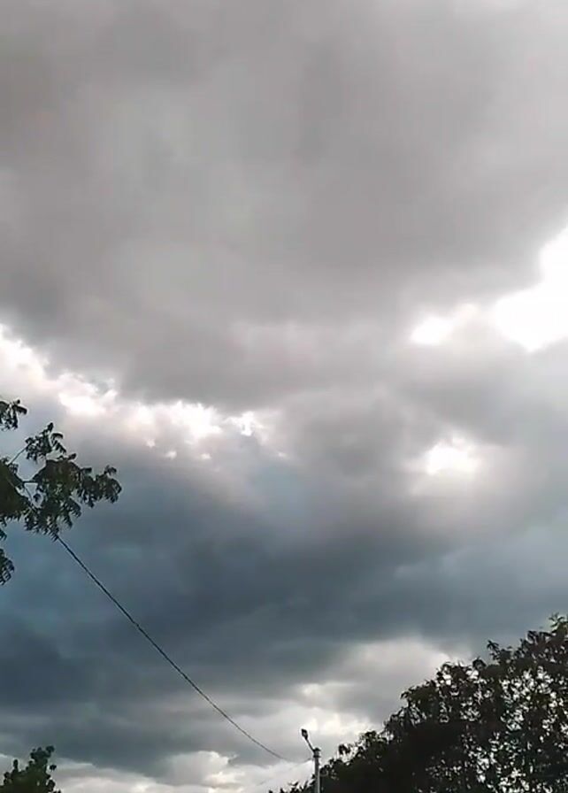low angle view of a cloudy sky with a few trees at the bottom of the frame. The clouds are dark gray and white, suggesting an overcast day. There is a hint of blue sky peeking through a gap in the clouds. A street light and electrical wire can be seen amidst the trees.