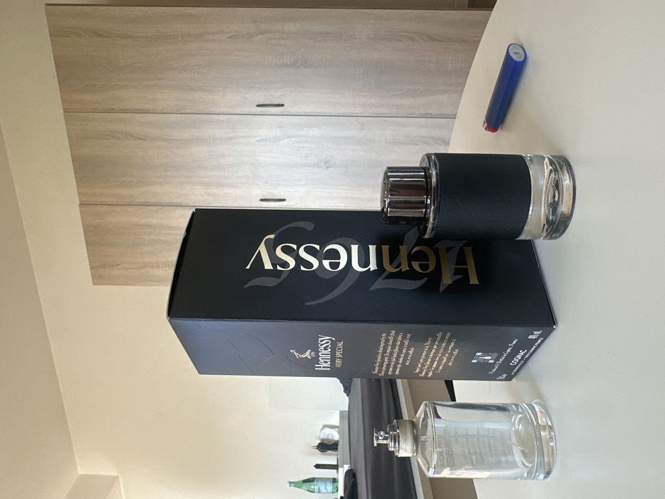The scene is an interior room in Höri, Switzerland, presented with a forensic perspective. In the foreground, positioned on a light-colored, possibly white, flat surface, are three primary objects arranged from left to right: an empty, clear glass bottle with an octagonal base, fitted with a silver-colored pump dispenser and a beige collar; a tall, black rectangular cardboard box labeled "Hennessy VERY SPECIAL" with gold and white text, prominently displaying the brand logo and indicating "COGNAC" and "40% vol"; and a cylindrical glass bottle containing a clear liquid, featuring a dark, textured band around its middle and topped with a reflective silver cap. To the far right, partially visible on the same surface, is a blue disposable lighter. The background consists of light-colored walls and large, light-wood-grain wardrobes with three visible doors, each equipped with a vertical dark handle. To the far left background, a dark-sheeted bed is partially visible, and on a surface behind it, a green bottle (possibly San Pellegrino) and several dark, slender objects are discernible. No individuals are present, and no active interactions are depicted. The environment is uniformly lit.