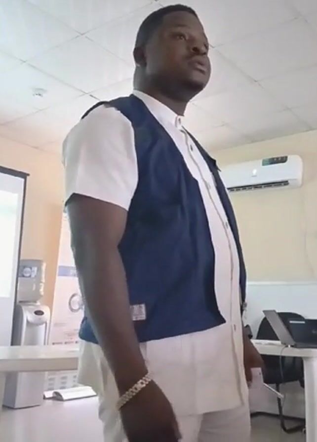 A man is standing in a room, gesturing with his hands as if speaking. He is wearing a short-sleeved white shirt, a navy-blue vest, and light-colored pants. The room appears to be a classroom or office setting, with a projector screen to his left and a table with a laptop and other items to his right. An air conditioning unit is visible on the wall above the laptop. There is also a water cooler and a whiteboard in the background.
