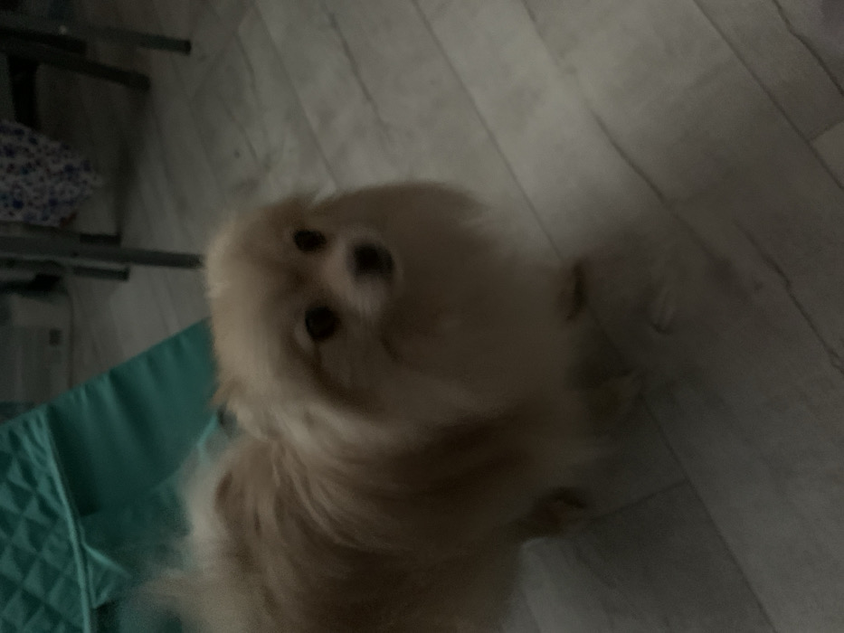 - "A light-colored Pomeranian dog, exhibiting a cream or beige coat, is depicted standing on a light-toned, wood-patterned floor indoors" by FM-9p7HR2, licensed under CC BY 4.0