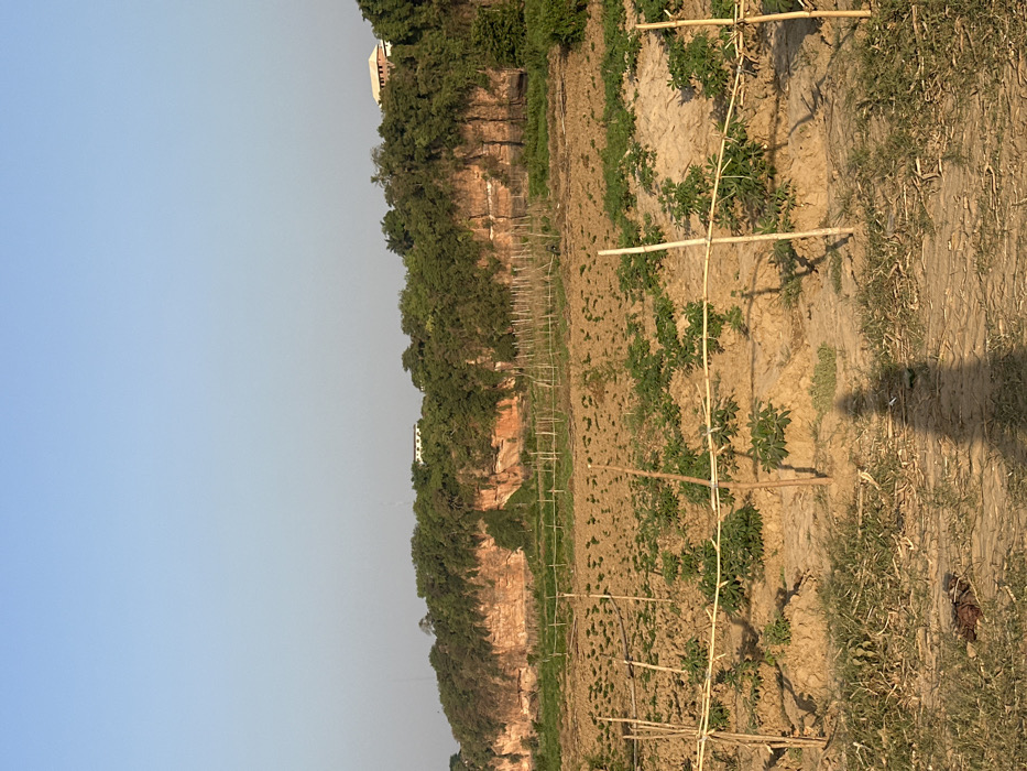 The image depicts an agricultural landscape located in Idah, Nigeria, under a clear, light blue sky. In the foreground, tilled brown earth shows rows of young, broad-leafed green plants supported by an irregular grid of vertical bamboo poles and horizontal cross-bars. A distinct, elongated dark human shadow extends from the bottom center across the tilled field towards the mid-ground, indicating a low sun angle. A small, dark, unidentifiable object lies on the ground in the lower-left corner. The mid-ground features more cultivated land, with numerous thin, vertical wooden stakes visible further back, potentially supporting additional crops or marking a boundary. A small, dark, indistinct figure is observable standing near the base of the cliff face in this area. Dominating the background is a prominent reddish-brown rocky cliff or escarpment, exhibiting varying textures and shades. The top of this cliff is densely covered with green trees and foliage, amongst which multiple structures with light-colored walls and reddish-brown roofs are visible, indicating human habitation.