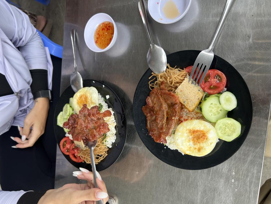 Two plates of Vietnamese broken rice dish (com tam) are on a stainless steel table. Each plate has rice, a fried egg, grilled pork chop, shredded pork skin, sliced cucumber and tomato. One plate has Vietnamese steamed pork cake. Small bowls of dipping sauce are placed near each plate. A fork and spoon are on each plate. A person is holding a fork with pork on it over one of the plates.