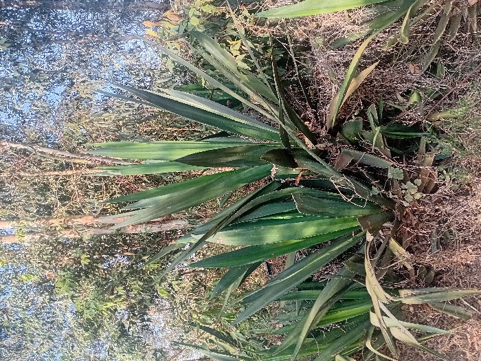 A sprawling agave-like plant dominates the scene, its thick, spiky leaves radiating outwards. The plant is surrounded by dry brush and foliage, creating a wild, untamed landscape. Sunlight filters through the surrounding trees, casting shadows and highlighting the texture of the leaves. The image captures the rugged beauty of a natural environment, showcasing the resilience of plant life in a seemingly harsh setting.