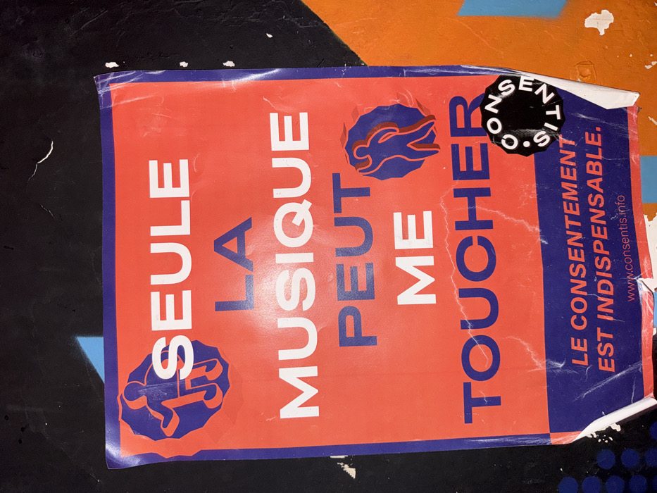 The image displays a poster predominantly in red and blue. White text reads "SEULE LA MUSIQUE PEUT ME TOUCHER" ("Only the music can touch me"). The blue sections include a logo of two figures touching hands, and a sticker that says "CONSENTIS.info." Another sticker says "NO CONSENTIS." Blue text on the right side states "LE CONSENTEMENT EST INDISPENSABLE" ("Consent is indispensable") along with the website "www.consentis.info." The poster appears affixed to a surface.