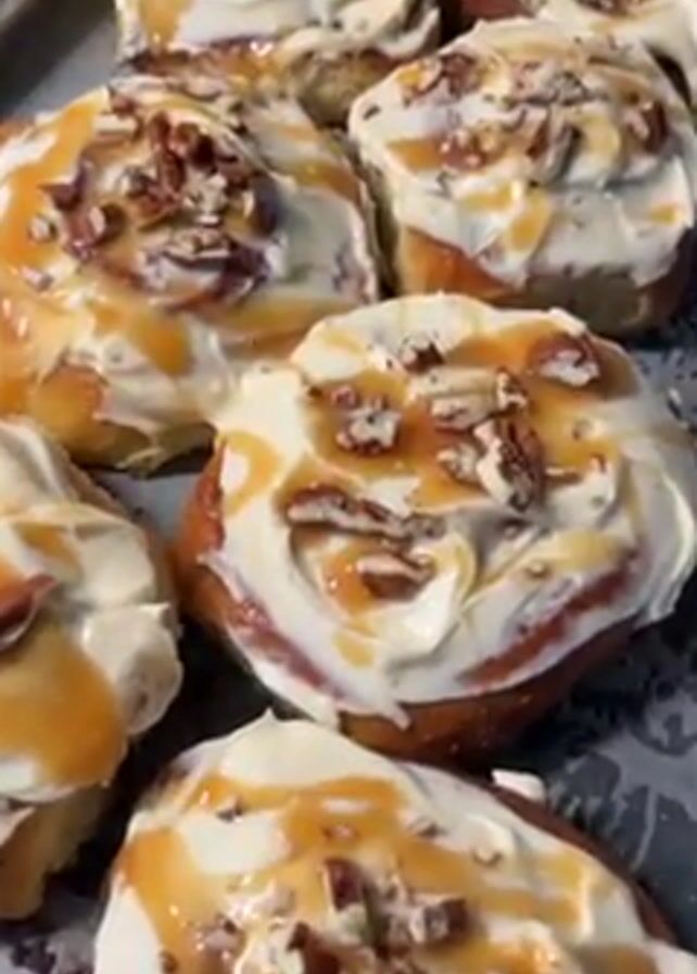 The camera zooms in on a tray of glazed, frosted cinnamon rolls. They are topped with chopped pecans and drizzled with caramel. A cat meows in the background.