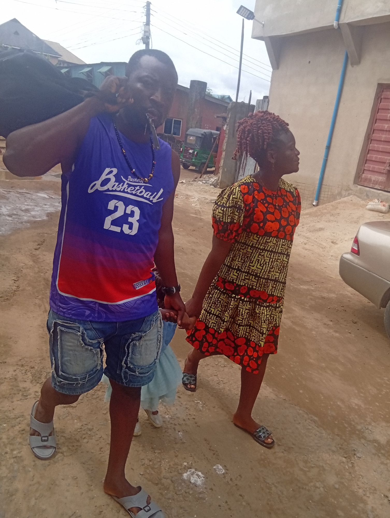 Two adults walk hand-in-hand on a dirt road in Umuode, Nigeria. The man wears a blue and red basketball jersey with the number 23, jean shorts, and grey sandals. He carries a black object over his left shoulder and has a key in his mouth. The woman is in a short-sleeved dress with orange and black patterns and slides. A small child in a light-colored dress is partially visible between them. In the background are buildings of different styles, including a light grey building with a water pipe and a parked car. An auto rickshaw is visible in the distance. The sky is overcast.