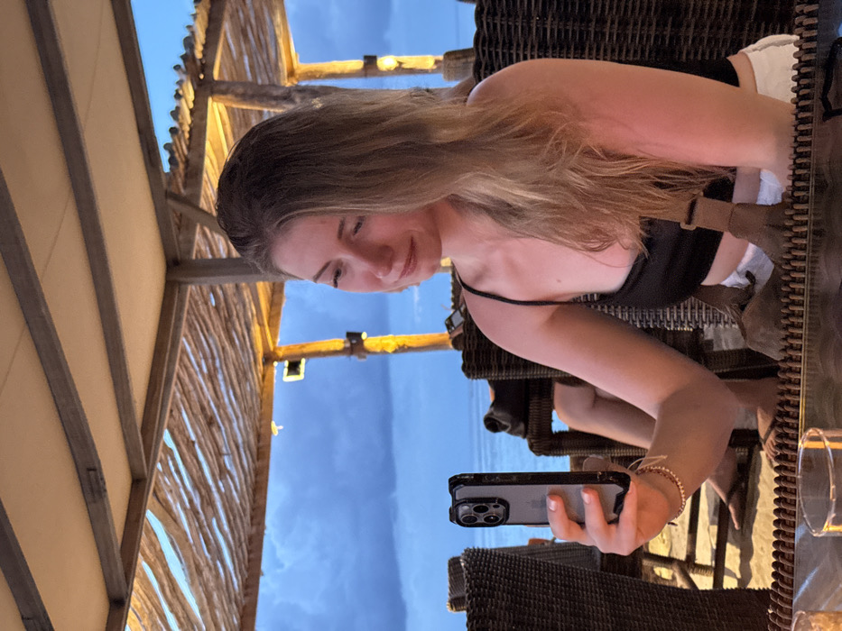 A young Caucasian female with long light-colored hair is seated outdoors at dusk in the city of Unknown, Indonesia